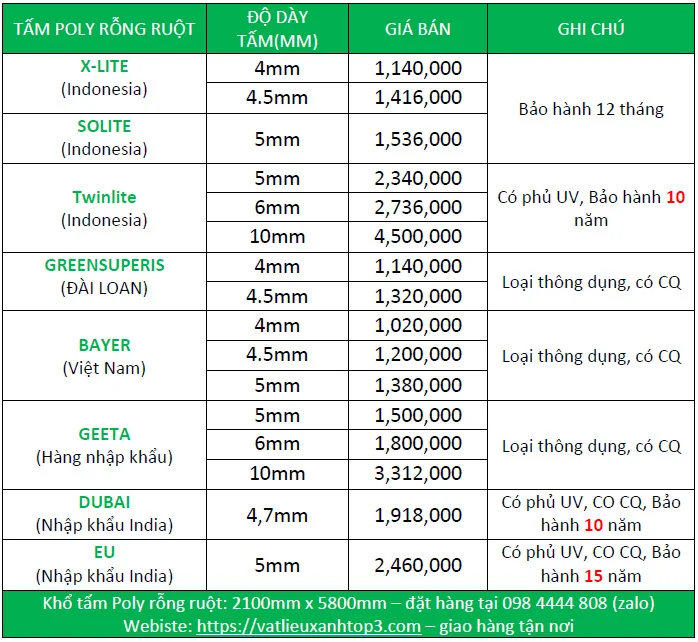 - Cho nhà xưởng, công trình lớn: Tấm rỗng ruột 4-6mm giúp cách nhiệt tốt, giá tiết kiệm.