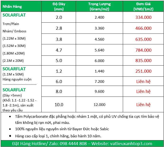 1/ Sử dụng 100% nguyên liệu Bayer (Xuất xứ Gemany) hoặc Sabic. Hàng Solarflat bảo hành 10 năm